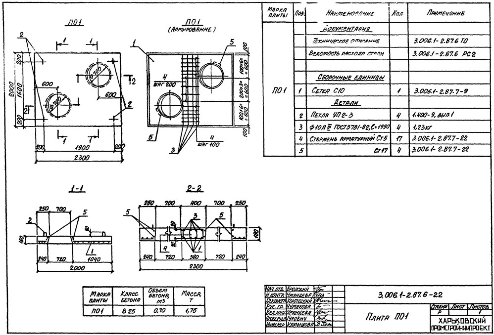 Технические требования и конструктивные схемы плиты определены проектной документацией серии 3.006.1-2.87, выпуск 6. Размеры плиты соответствуют следующим параметрам: длина — 2300 мм, ширина — 2000 мм, высота — 180 мм. Эти габариты оптимальны для стандартных схем перекрытия камер и узлов каналов.